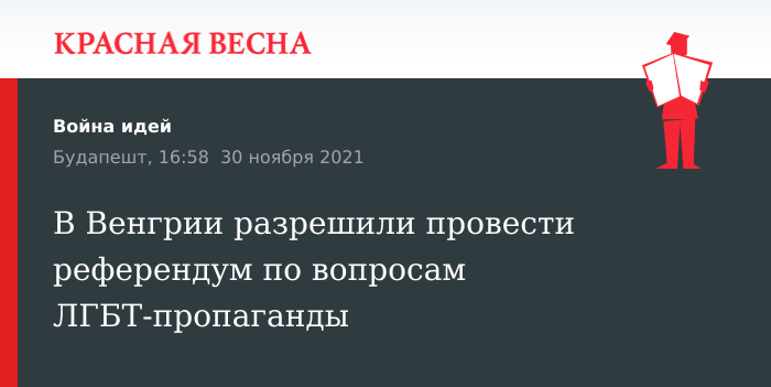 Проведение в Венгрии референдума по вопросам сексуальных меньшинств разрешил парламент страны 30 ноября, сообщает агентство Reuters.