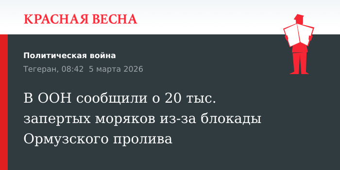 Около 20 тысяч моряков оказались заблокированы на обездвиженных судах из-за фактического закрытия движения по Ормузскому проливу. Об этом заявил генеральный секретарь Международной морской организации ООН Арсенио Домингес 5 марта в эфире Би-би-си.