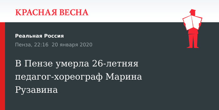 Солистка и педагог-хореограф театра эстрады «Провинция» Марина Рузавина скончалась на 26-м году жизни в Пензе, 20 января сообщает «Пензенская правда».