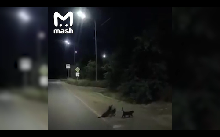 Водитель на ночной дороге запечатлел странную процессию. Как видно на записи, дорогу пыталась перейти раненая собака. А две кошки сопровождали ее с двух сторон.