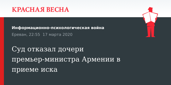 Отказом в приеме иска дочери премьер-министра Армении Шушаны Пашинян к главе общественной организации «Гражданское сознание» Нареку Самсоняну ответил Суд общей юрисдикции Еревана 17 марта, сообщает News.am.