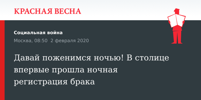 Первые ночные регистрации брака для восьми пар молодоженов провели сотрудники Грибоедовского ЗАГСа Москвы в ночь на воскресенье, сообщила зам. столичного мэра Анастасия Ракова 2 февраля ТАСС.