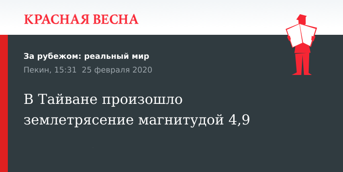 Землетрясение магнитудой 4,9 произошло на северо-востоке Тайваня 25 февраля, сообщили в Китайском сейсмологическом центре (CENC) на своем официальном сайте.