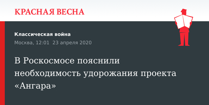 Напомним, 20 апреля СМИ сообщили, что часть бюджетных средств, предусмотренных на строительство стартового комплекса ракет «Ангара» на космодроме Восточный, направят на борьбу с коронавирусом. При этом сообщалось, что уменьшится финансирование только строительства стартового комплекса, а не разработки ракеты-носителя.