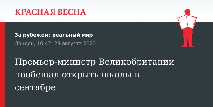 Напомним, ранее в августе британский премьер-министр заявил, что открытие школ в сентябре представляет из себя социальную, экономическую и моральную необходимость, оговорив при этом, что школы должны соблюдать все правила предосторожности в связи с пандемией COVID-19.