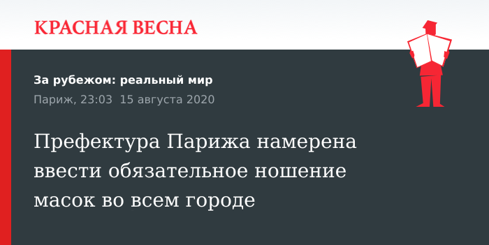 Префектура полиции Парижа предупредила, что для предотвращения распространения коронавирусной инфекции в городе необходимо усилить санитарные меры. В связи с этим ранее принятое решение об обязательном ношении масок на центральных улицах, возможно, придется распространить на весь город.