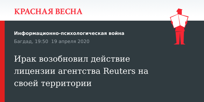 Напомним, что причиной отзыва лицензии явилось сообщение агентства, в котором утверждалось, что власти Ирака занижают количество зараженных новым коронавирусом человек. По заверениям властей количество зараженных составляет 772 случая, по заявлению Reuter эта цифра составляет несколько тысяч.