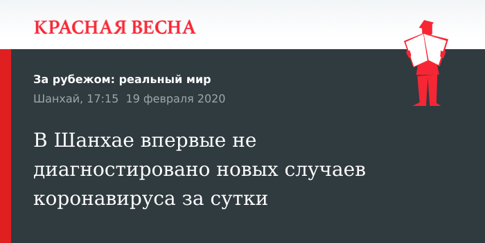 Проверки санитарными службами в крупном китайском мегаполисе Шанхае впервые не выявили за сутки ни одного нового заболевшего коронавирусом, 19 февраля сообщил Шанхайский комитет по делам здравоохранения, передает агентство «Синьхуа».