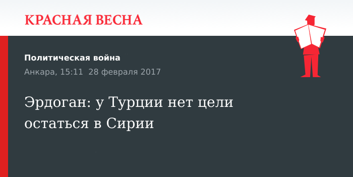 Турция не ставит целью оставлять свой вооруженный контингент в Сирии, при этом готова в случае необходимости продолжить военную операцию, заявил президент Турции Реджеп Тайип Эрдоган 28 февраля на пресс-конференции в Анкаре, передает РИА Новости.