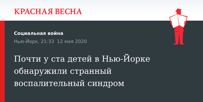 Примерно у сотни детей и подростков штата Нью-Йорк диагностировано заболевание воспалительным синдромом, возможно связанным с коронавирусом, заявил 12 мая губернатор штата Эндлрю Куомо в ходе пресс-конференции, посвященной проблеме пандемии коронавируса.
