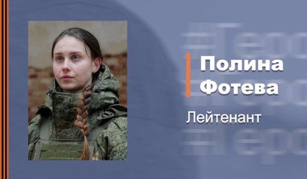 Самоотверженность, отвага и самообладание гвардии лейтенанта Полины Фотевой, обнаружившей и обеспечившей уничтожение бронетехники украинских неонацистов, позволили одержать победу и сорвать наступление боевиков в ходе выполнения спецоперации по освобождению Донбасса и денацификации Украины. Об этом 28 декабря сообщила пресс-служба Минобороны РФ.