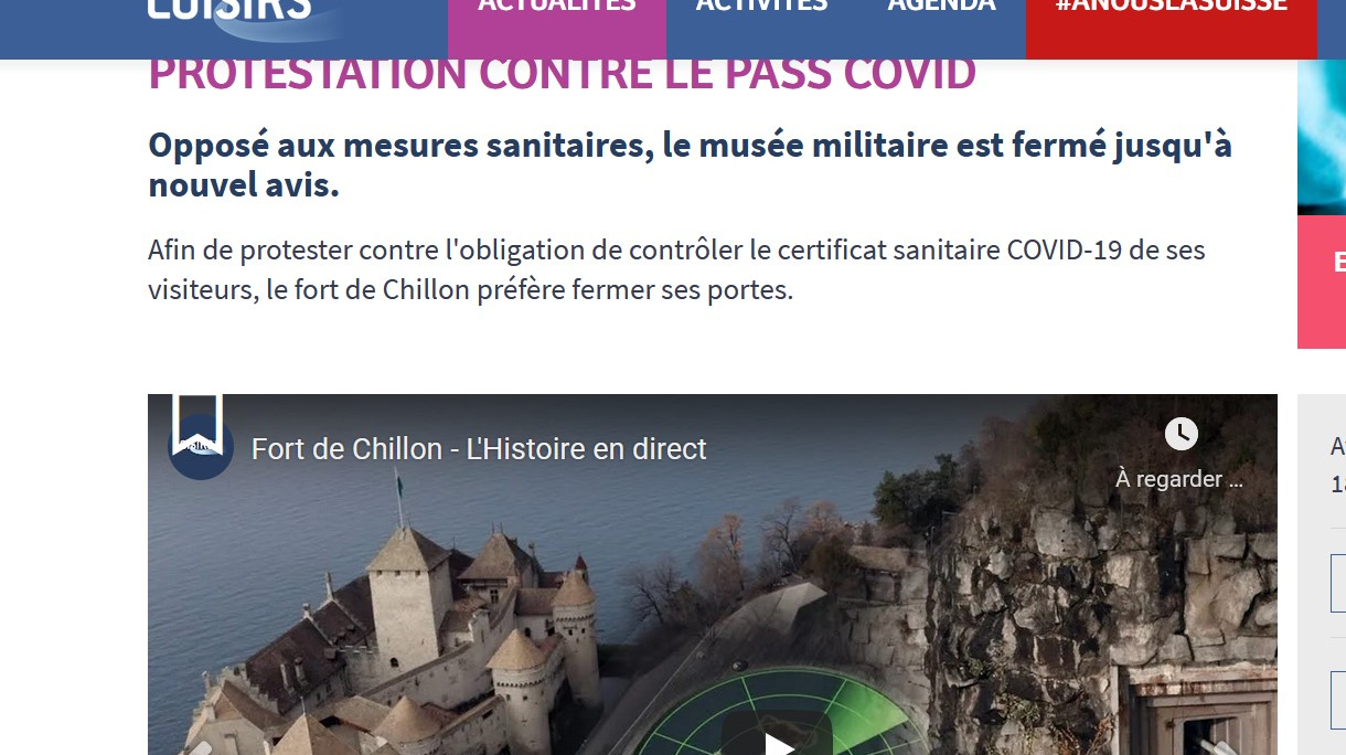 «Не согласный с [введенными] санитарными мерами, военный музей закрыл свои двери до новых указаний», — сказано на новостной странице портала, где поясняется, что «в качестве протеста против необходимости проверять ковид-паспорта посетителей, Форт-де-Шильон предпочитает закрытие».
