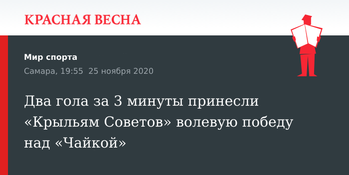 Волевую победу над песчанокопской «Чайкой» одержали самарские «Крылья Советов» в матче 24-го тура Футбольной национальной лиги (ФНЛ) 25 ноября в Самаре.