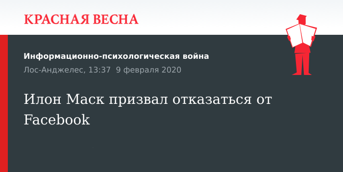 Призыв удалить аккаунты в социальной сети Facebook к своим подписчикам сделал бизнесмен и основатель Tesla и SpaceX Илон Маск 9 февраля в своем Twitter-аккаунте.