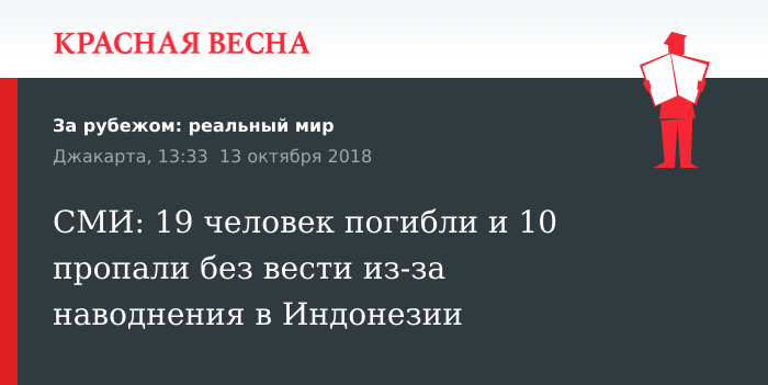 В результате наводнения в Индонезии погибло 19 и пропало без вести 10 человек, 13 октября передает ТАСС.