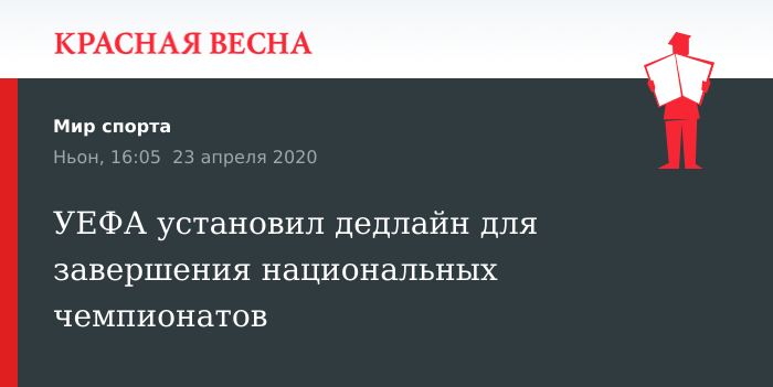 Дедлайн на завершение текущего сезона в европейских футбольных лигах установило руководство Союза европейских футбольных ассоциаций (УЕФА), 23 апреля сообщает Sport Mediaset.