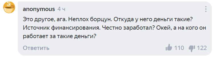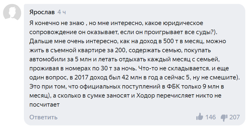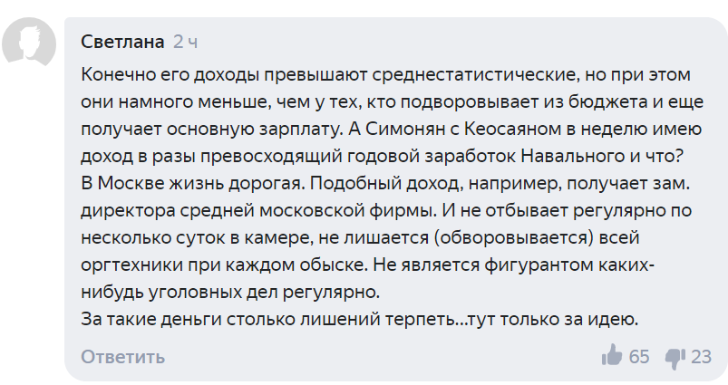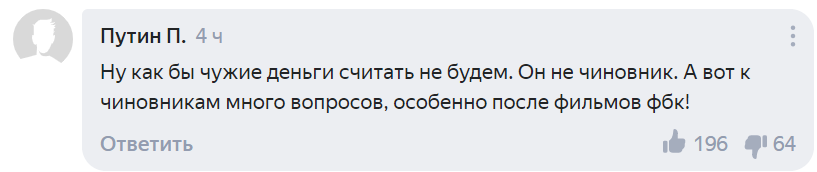 Наибольшую популярность получил комментарий пользователя Ярослав, который усомнился как в юридической компетентности Навального, так и в том, что тот сообщил о всех своих доходах за год.