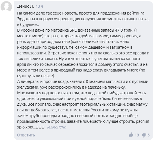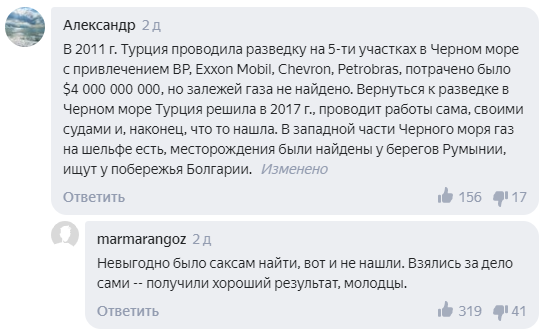 Комментаторы отметили, что обнаружение запасов газа произошло только после того, когда Турция отказалась от услуг иностранных компаний и самостоятельно занялась поисками.