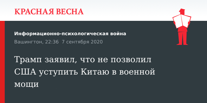 Напомним, 4 сентября госсекретарь Майк Помпео заявил, что Трамп обеспокоен расширением военных возможностей Китая. По его словам, при нынешнем президенте военный бюджет США два года подряд составляет более 700 миллиардов долларов, а армия имеет все необходимое.