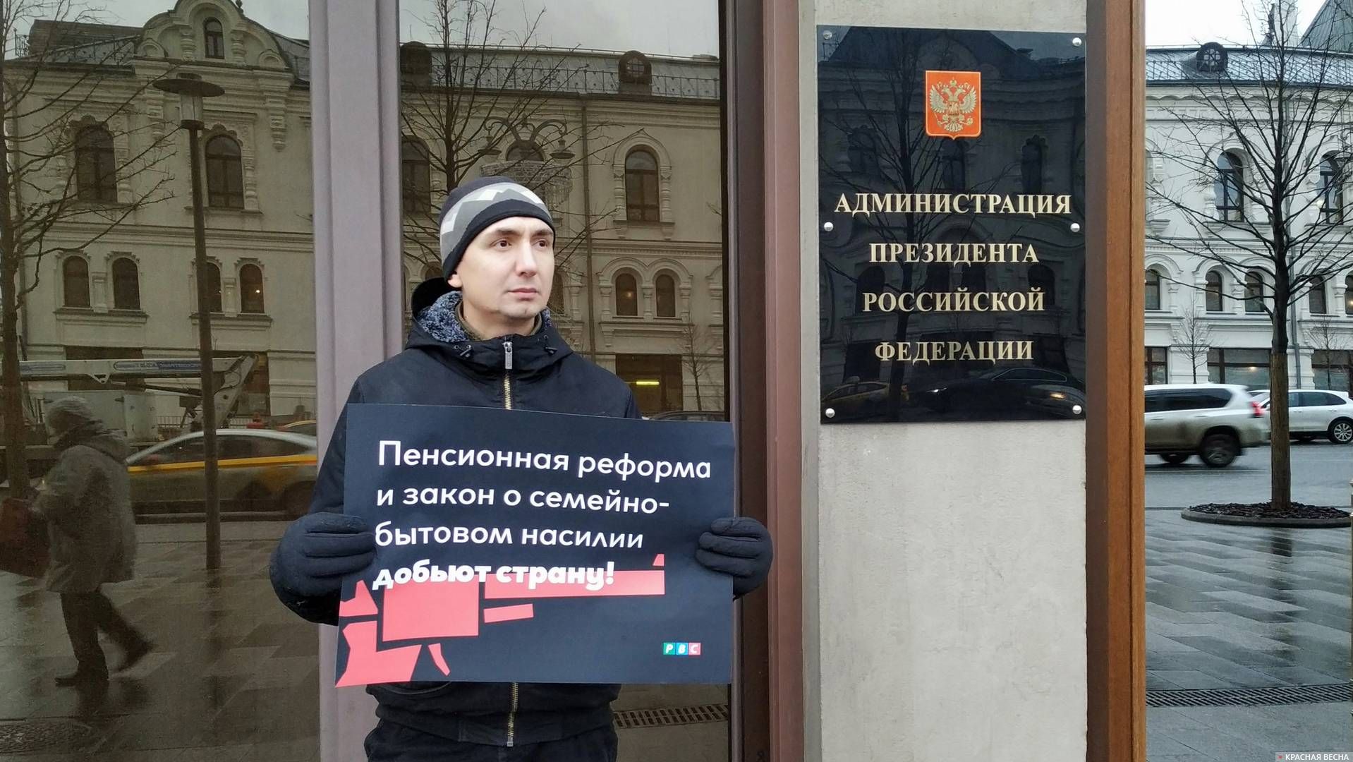 Утром 17 января активисты РВС продолжили одиночное пикетирование Администрации президента, протестуя против пенсионной реформы и закона о семейно-бытовом насилии (СБН).