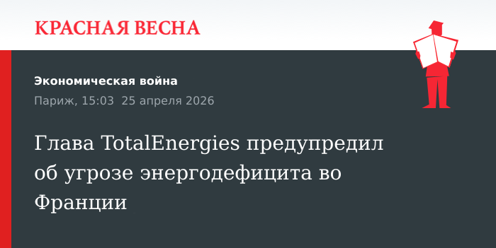 Франции угрожает энергетический дефицит из-за ситуации на Ближнем Востоке и блокировки Ормузского пролива, заявил гендиректор французской компании TotalEnergies Патрик Пуянне, 24 апреля пишет газета Le Parisien.