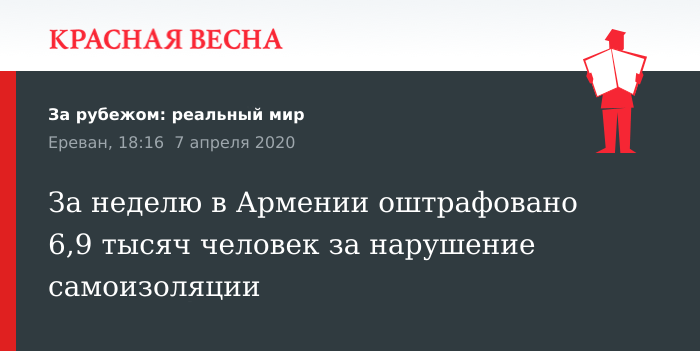При этом уточняется, что средний размер штрафа за нарушение режима самоизоляции составляет 100 тысяч драмов (порядка 15 тысяч рублей).
