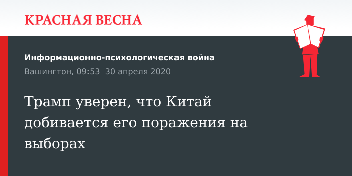 Власти Китая добиваются поражения действующего президента США на предстоящих президентских выборах, заявил глава Белого дома Дональд Трамп 29 апреля в интервью агентству Reuters.
