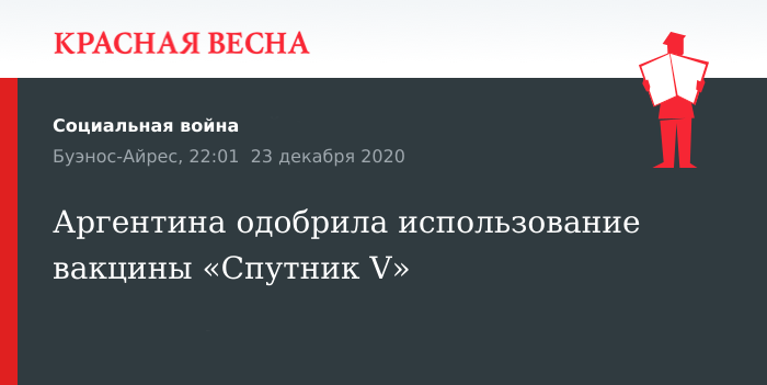 Применение российской вакцины «Спутник V» одобрили власти Аргентины, 23 декабря со ссылкой на Минздрав страны сообщает аргентинский телеканал TN.