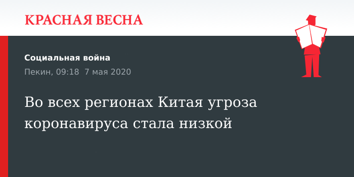 Уровень эпидемиологической опасности во всех регионах Китая стал низким, 7 мая сообщило Центральное телевидение КНР.