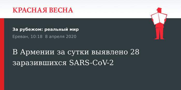 За последние сутки в Армении выявлено 28 случаев заражения SARS-CoV-2, один больной скончался, 8 апреля сообщает Национальный центр по контролю и профилактике заболеваний.