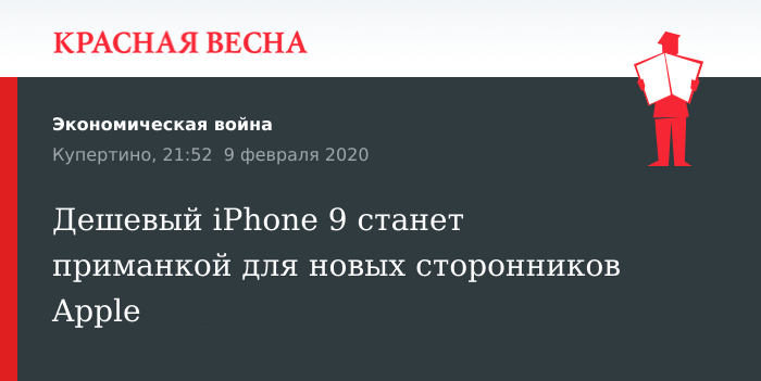 Стоимость еще не вышедшего iPhone 9 от компании Apple окажется самой низкой в истории продаж популярного смартфона. К такому выводу пришли некоторые эксперты, мнение которых было опубликовано 7 февраля в американском журнале Fast Company.