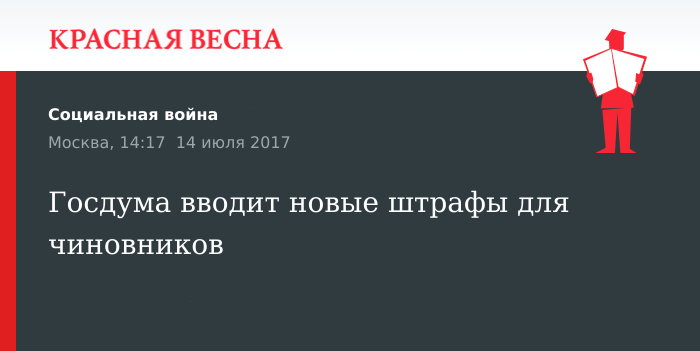 Напомним, что сегодня Госдумой принят закон об административной ответственности за нарушение чиновниками срока и порядка оплаты товаров, работ или услуг при государственных закупках, предусматривающий штраф от 30 до 50 тысяч рублей. Двумя днями ранее, 12 июля, в Госдуму внесен законопроект по штрафам чиновникам за незаконную выдачу земель в заповедниках.