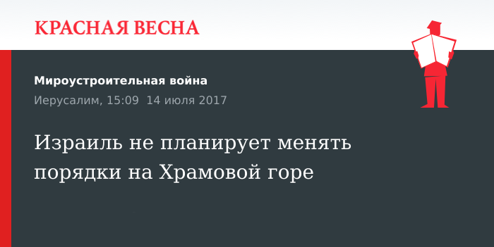 Напомним, утром 14 июля трое арабов родом из Израиля убили двоих полицейских, которые несли дежурство у входа на Храмовую гору. Преступники попытались скрыться на территории храмового комплекса, но были застрелены в ходе преследования. Доступ на Храмовую гору был перекрыт с целью убедиться в отсутствии оружия на территории. Также были отменены вечерние молитвы в храмах, расположенных на Храмовой горе.