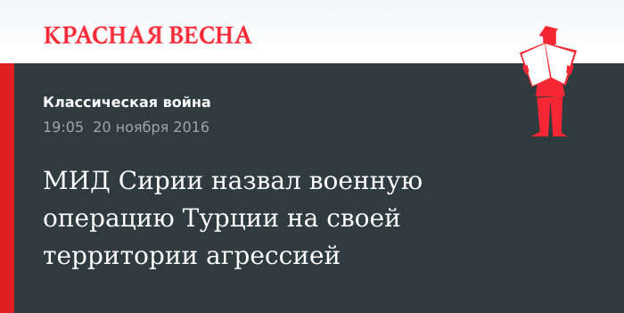 Прямой агрессией против Сирии назвал операцию турецких войск на севере своей страны глава сирийского МИДа Валид Муаллем 20 ноября, сообщает Интерфакс.