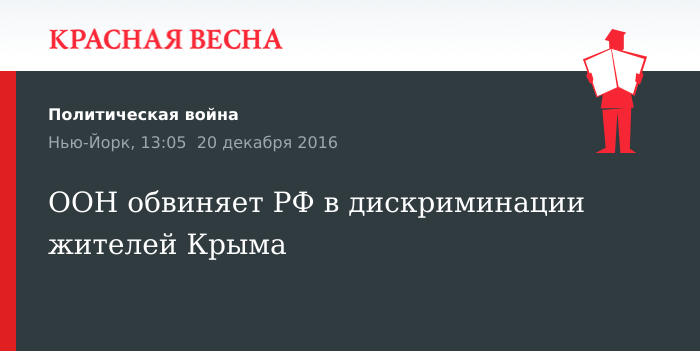 70 депутатов разных государств из 193 стран, входящих в ООН, осуждают действия России за «ущемление прав человека и дискриминационные меры» по отношению к жителям Крымского полуострова, говорится в резолюции, принятой вчера, 19 декабря, в рамках 65-й пленарной встречи Генеральной Ассамблеи ООН в Нью-Йорке.