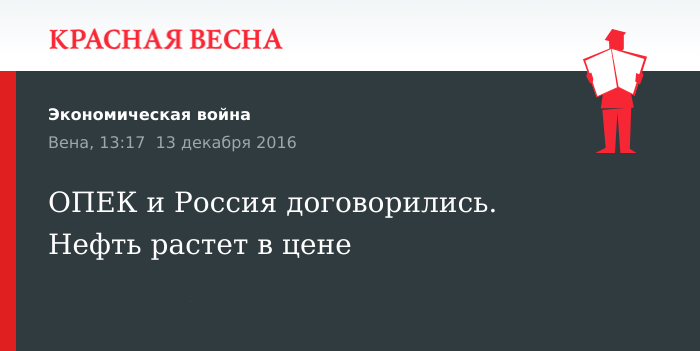 Напоминаем, 10 декабря в Вене состоялась встреча стран ОПЕК и 11 стран производителей нефти. Был заключен полугодовой договор о сокращении добычи с 1 января 2017 года. Ожидается, что это позволит удержать нефтяные цены на уровне $50 — $55 за баррель.