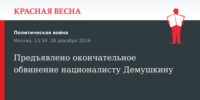 Демушкин обвиняется в размещении в сети Интернет в 2011–2013 годах материалов, разжигающих «ненависть и вражду к определенной группе лиц». В преддверии «Русского марша» 2016 года он был заключен под домашний арест за нарушение условий подписки о невыезде. 19 декабря Пресненский суд Москвы продлил домашний арест до 21 февраля 2017 года.