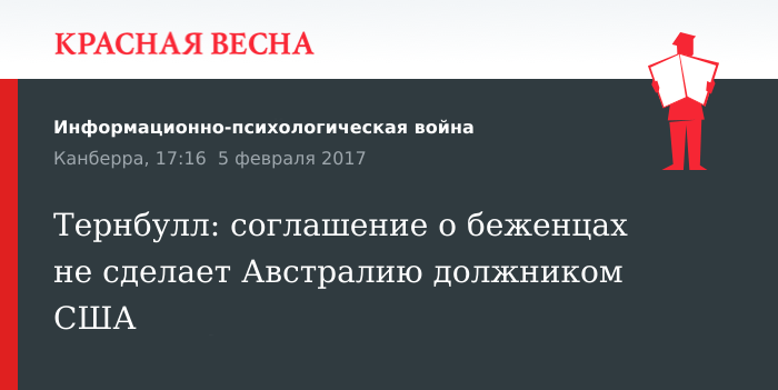 Напомним также, что разовое соглашение о переселении беженцев из Австралии в США было подписано в ноябре 2016 года премьер-министром Австралии Тернбуллом и президентом США Бараком Обамой, завершающим свой второй президентский срок.