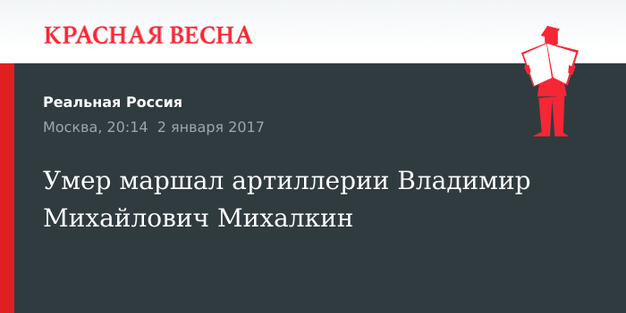 «1 января 2016 года на 90-м году жизни скончался участник Великой Отечественной войны генеральный инспектор Управления генеральных инспекторов Министерства обороны РФ маршал артиллерии Михалкин Владимир Михайлович».
