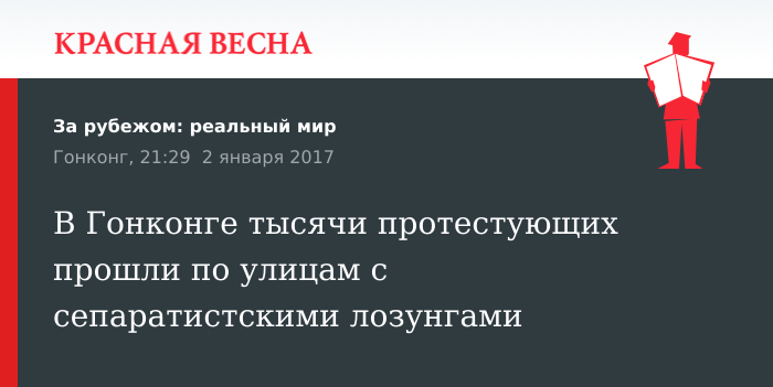 Демократический марш в Гонконге собрал 1 января несколько тысяч протестующих. Среди плакатов, которые несли демонстранты, было большое количество сепаратистских. Самый популярный из них: «Гонконг — это не Китай!». Главное требование протестующих — больше независимости от Пекина.
