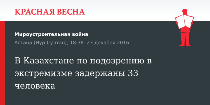 Комитет по национальной безопасности Казахстана провел обыски и аресты в Алматинской, Актюбинской, Атырауской областях и городе Алматы. В результате было задержано 33 человека. Они подозреваются в принадлежности к экстремистской организации «Ат-Такфир валь-Хиджра», деятельность которой запрещена не только в Казахстане, но и в России и США. В ходе обысков следователям удалось обнаружить религиозные материалы, компакт-диски и крупные суммы денег.