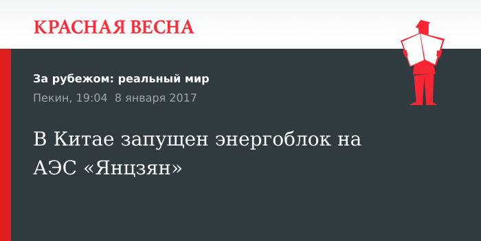 О начале работы нового, четвертого по счету, энергоблока крупнейшей китайской АЭС «Янцзян» сообщили в курирующей ее Гуандунской ядерно-энергетической корпорации, передает 8 января агентство Синьхуа.