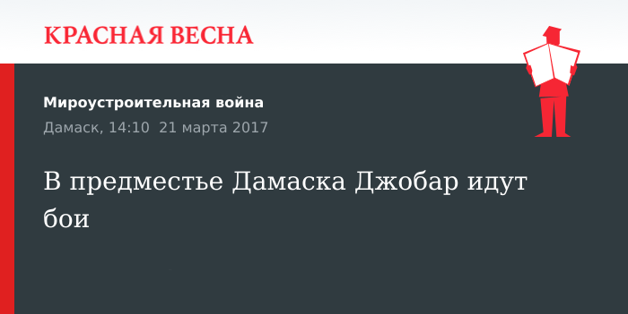 В Сирийском предместье Дамаска Джобар идут бои между правительственными войсками и террористами группировки Джебхат ан-Нусра (организация, деятельность которой запрещена в РФ), сообщает 21 марта РИА Новости.