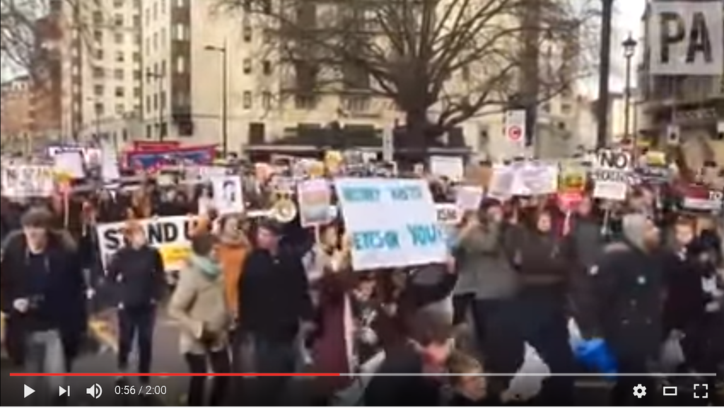 Протестная акция в Лондоне началась у американского посольства на Гросвенор-сквер. Далее демонстранты прошли по центральной части города в сторону Вестминстера.