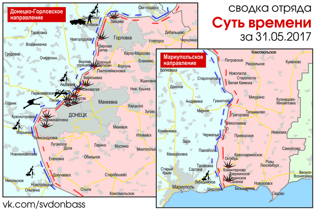По итогам предыдущих суток, 30 мая, ВСУ 65 раз нарушили режим прекращения огня, обстреляв 17 населенных пунктов республики. Украинская армия вела огонь из артиллерии, танков, минометов, вооружения БМП и БТР, гранатометов и стрелкового оружия.